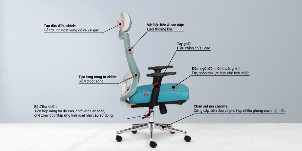 Một chiếc ghế nhân viên chất lượng không chỉ đẹp mà còn phải hiểu cơ thể người dùng. Dưới đây là những bộ phận và đặc điểm quan trọng cần lưu ý: